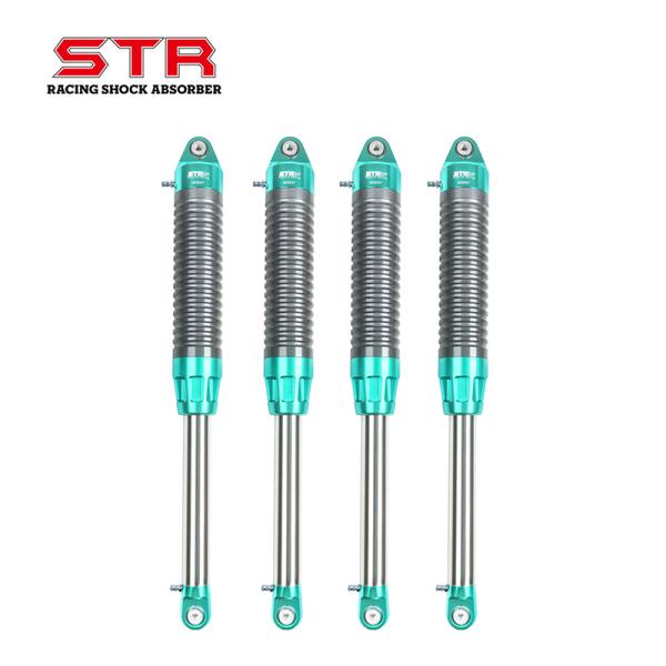 STR Strut is a popular and versatile offroad strut/shock combination for rock crawlers, trucks, buggies, desert racers, and other custom off-road builds. The STR struts feature unique dual nitrogen charged chambers for unmatched stability in off-road suspension, and are fully tunable to obtain any level of stability, ride height, and spring rate desired. The STR struts is designed with high grade billet 6061 aluminum, stainless steel internal components, and chrome plated piston shafts to be light weight, durable, and compact. Built into the compression damping is a 1 inch hydraulic bump stop, high flow oil return passageways, and a velocity sensitive compression valve that helps prevent bottoming out on hard hits to make for a 3 stage compression damping stroke. With a compact 3.2" body, 2" piston, and a 1.75" diameter piston shaft, the struts are compact enough to fit under most builds, and strong enough to hold up in harshest conditions. They come in a variety of standard lengths (8"- 20"), and can be custom ordered up to30" travel length.